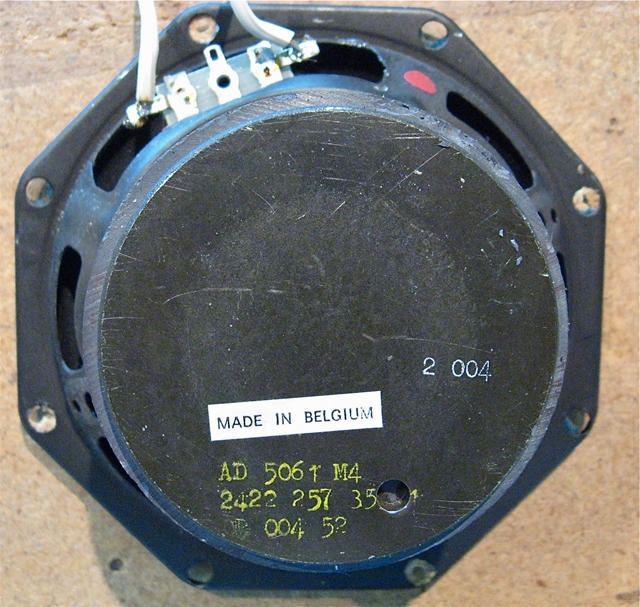 Philips 5" (128mm)* paper cone full range drivers with 2 3/16" (55mm) whizzer cone -- this is terminated with a flat ring which helps reduce whizzer resonances.    Voice Coil is 1" (25mm). It has the trademark octagonal 8-legged stamped basket. Drivers have cloth surrounds.